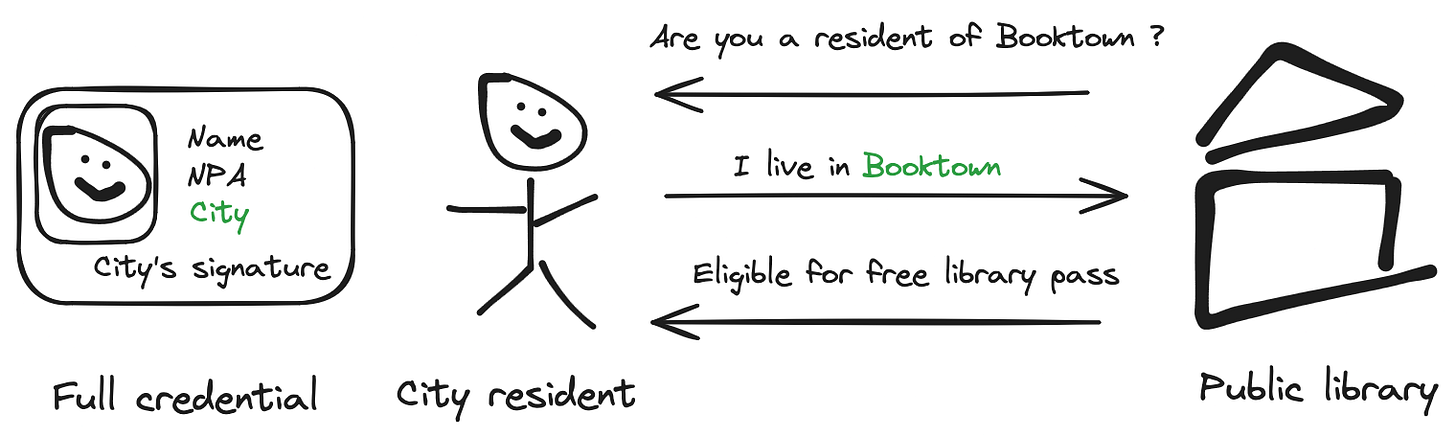The Issuer-Holder-Verifier triangle is the design that empowers users to decide with whom they share identifying information. No direct contact is required between the issuing authority (the city) and the verifying party (the library) and the holder can - in theory - accept or reject interactions with a verifier.
